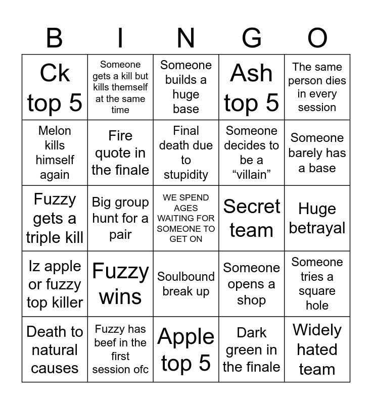 This bingo card has a free space and 24 words: Fuzzy wins, Fuzzy has beef in the first session ofc, Final death due to stupidity, Death to natural causes, The same person dies in every session, Ck top 5, Melon kills himself again, Someone gets a kill but kills themself at the same time, Secret team, Soulbound break up, Someone decides to be a “villain”, Fuzzy gets a triple kill, Someone opens a shop, Someone tries a square hole, Fire quote in the finale, Dark green in the finale, Huge betrayal, Someone builds a huge base, Someone barely has a base, Big group hunt for a pair, Widely hated team, Iz apple or fuzzy top killer, Ash top 5 and Apple top 5.
