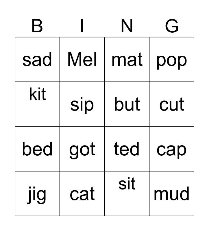This bingo card has 16 words: cat, cap, mat, sad, bed, Mel, ted, sit, kit, sip, jig, pop, got, cut, but and mud.