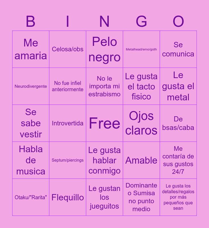 This bingo card has a free space and 24 words: Otaku/"Rarita", Septum/piercings, No le importa mi estrabismo, Dominante o Sumisa no punto medio, Se comunica, Me amaria, Celosa/obs, Pelo negro, Ojos claros, De bsas/caba, Se sabe vestir, No fue infiel anteriormente, Amable, Me contaría de sus gustos 24/7, Neurodivergente, Flequillo, Le gustan los jueguitos, Metalhead/emo/goth, Le gusta el metal, Habla de musica, Introvertida, Le gusta hablar conmigo, Le gusta el tacto fisico and Le gusta los detalles/regalos por más pequeños que sean.