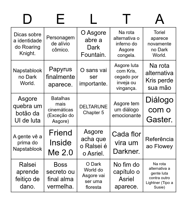 This bingo card has a free space and 24 words: Friend Inside Me 2.0, Boss secreto ou final alma vermelha., O sans vai ser importante., Ralsei aprende feitiço de dano., Toriel aparece novamente no Dark World., Dicas sobre a identidade do Roaring Knight., Napstablook no Dark World., Personagem de alívio cômico., Asgore tem um diálogo emocionante, Asgore acha que o Ralsei é o Asriel., Asgore luta com Kris, cegado por inveja ou vingança., Asgore quebra um botão da UI de luta, Cada flor vira um Darkner., Referência ao Flowey, Papyrus finalmente aparece., No fim do capítulo o Asriel aparece., Diálogo com o Gaster., O Asgore abre a Dark Fountain., Na rota alternativa Kris perde sua mão, Batalhas mais cinemáticas (Exceção do Asgore), Na rota alternativa a gente luta contra outro Lightner (Tipo a Susie), A gente vê a prima do Napstablook, Na rota alternativa o inferno do Asgore congela. and O Dark World do Asgore vai ser uma floresta.