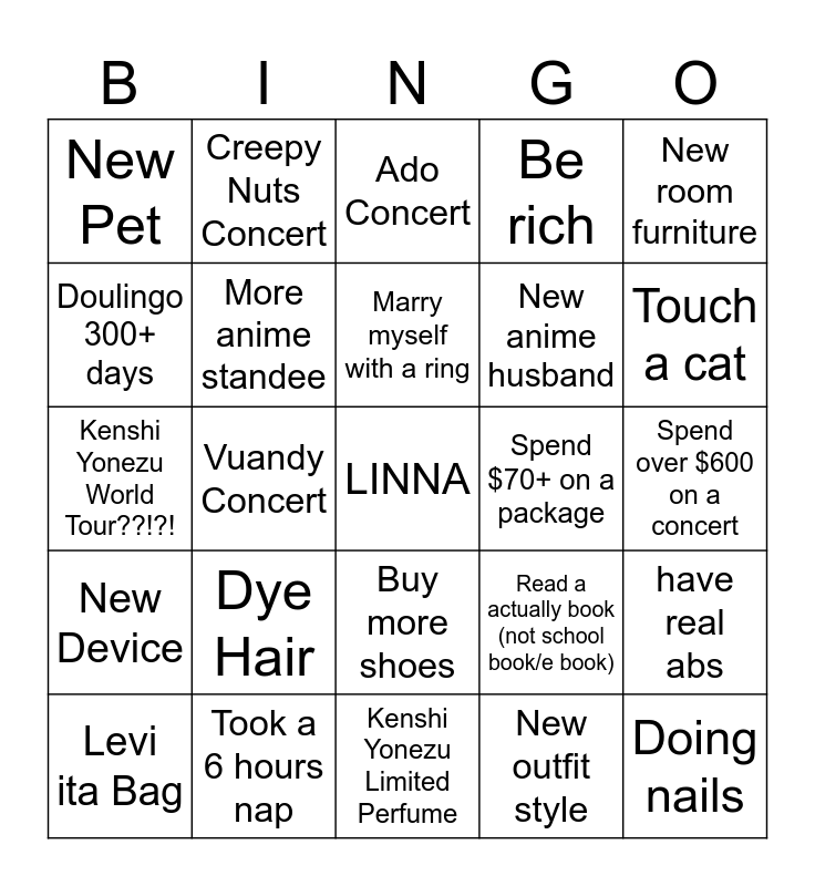 This bingo card has a free space and 24 words: Dye Hair, Took a 6 hours nap, Marry myself with a ring, Levi ita Bag, New room furniture, New Pet, Doulingo 300+ days, Creepy Nuts Concert, Spend $70+ on a package, Buy more shoes, New anime husband, Kenshi Yonezu World Tour??!?!, Read a actually book (not school book/e book), have real abs, More anime standee, New outfit style, Spend over $600 on a concert, Ado Concert, Touch a cat, Vuandy Concert, Doing nails, New Device, Be rich and Kenshi Yonezu Limited Perfume.