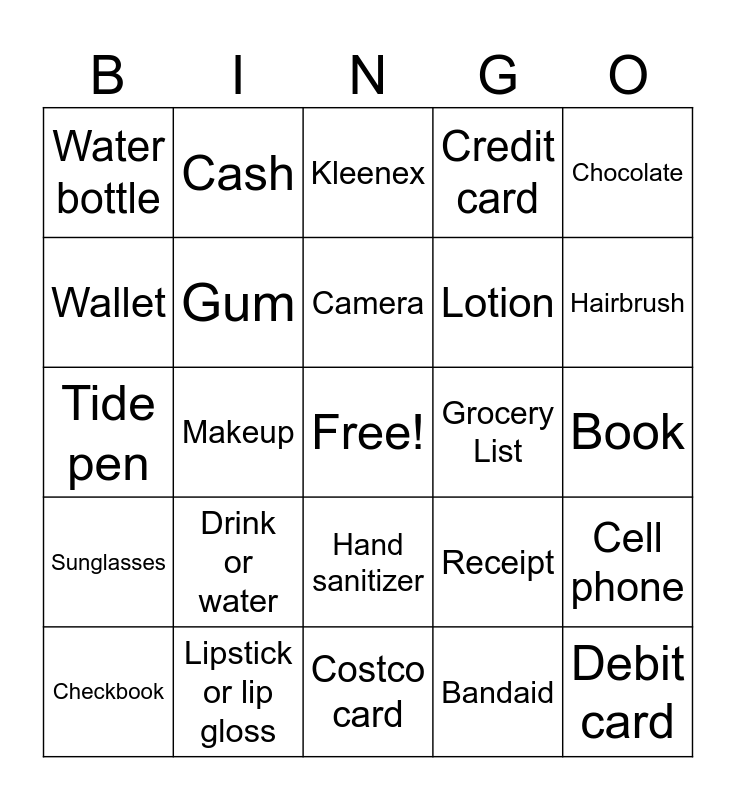 This bingo card has a free space and 34 words: Driver’s License, Bandaid, Nail File, Bridal Shower Invitation, Sunglasses, Gum, Chocolate, Checkbook, Cash, Ibuprofen or tyle, Camera, Kleenex, Business Card, Hair ties, Grocery List, Hairbrush, Lipstick or lip gloss, Tide pen, Drink or water, Receipt, Hand sanitizer, Coins, Water bottle, Book, Costco card, Debit card, Credit card, Pen or pencil, Lotion, Wallet, Keys, Makeup, Cell phone and Feminine products.