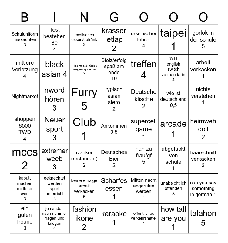 This bingo card has a free space and 48 words: Mitten nacht angerufen werden 1, 7/11 english switch zu mandarin 4, karaoke 1, Neuer sport 3, Furry 5, heimweh doll 2, Test bestehen 80 4, jemanden nach nummer fragen und kriegen 4, taipei 1, Deutsches Bier 2, gorlok in der schule 5, krasser jetlag 2, wie ist deutschland 0,5, Deutsche klische 2, kaputt machen mittlerer wert 3, arcade 1, mittlere Verletzung 4, arbeit verkacken 1, unabsichtlich offenden 3, rassitischer lehrer 4, treffen 4, Club 1, Schuluniform missachten 3, black asian 4, can you say something in german 1, missverständniss wegen sprache 2, nichts verstehen 1, ein guten freund 3, typisch asian stero 2, nword hören 3, how tall are you 1, supercell game 1, haarschnitt verkacken 3, geknechtet werden sport unterricht 3, shoppen 8500 TWD 4, nah zu frau/gf 5, abgefuckt von schule 1, Nightmarket 1, clanker (restaurant) 2, keine einzige arbeit verkacken 5, mccs 2, talahon 5, exotisches essen/getränk 2, fashion ikone 2, Stolz/erfolg spaß am ende 10, Scharfes essen 1, extremer weeb 3 and öffentliches verkehrsmittel 1.