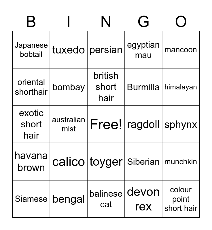 This bingo card has a free space and 24 words: Siamese, calico, british short hair, devon rex, mancoon, Japanese bobtail, tuxedo, persian, ragdoll, sphynx, exotic short hair, bombay, Siberian, munchkin, oriental shorthair, bengal, balinese cat, egyptian mau, himalayan, havana brown, australian mist, toyger, Burmilla and colour point short hair.