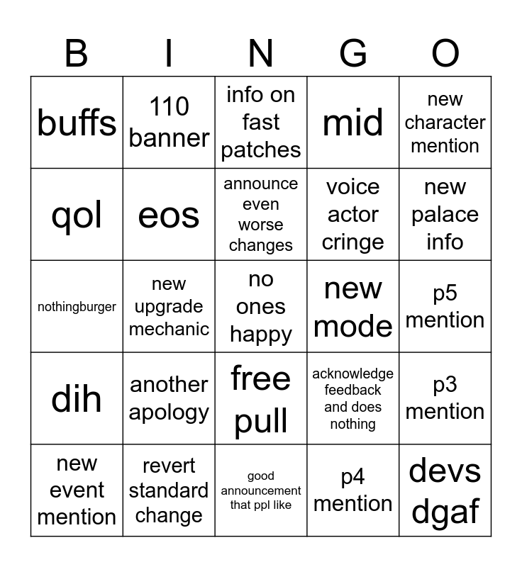 This bingo card has a free space and 24 words: another apology, revert standard change, announce even worse changes, new event mention, new character mention, buffs, qol, 110 banner, new mode, free pull, voice actor cringe, nothingburger, acknowledge feedback and does nothing, p3 mention, eos, p4 mention, p5 mention, info on fast patches, new palace info, new upgrade mechanic, devs dgaf, dih, mid and good announcement that ppl like.