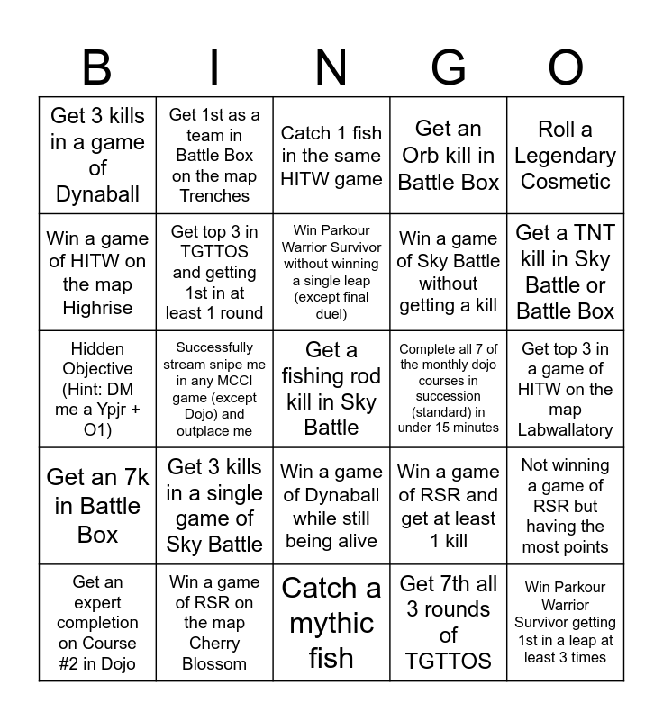 This bingo card has 25 words: Get an 7k in Battle Box, Win a game of RSR on the map Cherry Blossom, Get a fishing rod kill in Sky Battle, Get 7th all 3 rounds of TGTTOS, Roll a Legendary Cosmetic, Get 3 kills in a game of Dynaball, Get 1st as a team in Battle Box on the map Trenches, Catch 1 fish in the same HITW game, Complete all 7 of the monthly dojo courses in succession (standard) in under 15 minutes, Not winning a game of RSR but having the most points, Win a game of HITW on the map Highrise, Get top 3 in TGTTOS and getting 1st in at least 1 round, Catch a mythic fish, Win a game of RSR and get at least 1 kill, Get a TNT kill in Sky Battle or Battle Box, Get an expert completion on Course #2 in Dojo, Successfully stream snipe me in any MCCI game (except Dojo) and outplace me, Win Parkour Warrior Survivor without winning a single leap (except final duel), Win a game of Sky Battle without getting a kill, Get top 3 in a game of HITW on the map Labwallatory, Hidden Objective (Hint: DM me a Ypjr + O1), Get 3 kills in a single game of Sky Battle, Win a game of Dynaball while still being alive, Get an Orb kill in Battle Box and Win Parkour Warrior Survivor getting 1st in a leap at least 3 times.