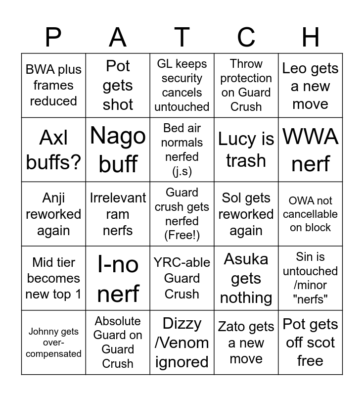 This bingo card has a free space and 24 words: I-no nerf, Absolute Guard on Guard Crush, Bed air normals nerfed (j.s), Johnny gets over-compensated, Leo gets a new move, BWA plus frames reduced, Axl buffs?, Pot gets shot, Sol gets reworked again, YRC-able Guard Crush, Lucy is trash, Anji reworked again, Asuka gets nothing, Sin is untouched /minor "nerfs", Nago buff, Zato gets a new move, OWA not cancellable on block, GL keeps security cancels untouched, WWA nerf, Irrelevant ram nerfs, Pot gets off scot free, Mid tier becomes new top 1, Throw protection on Guard Crush and Dizzy /Venom ignored.