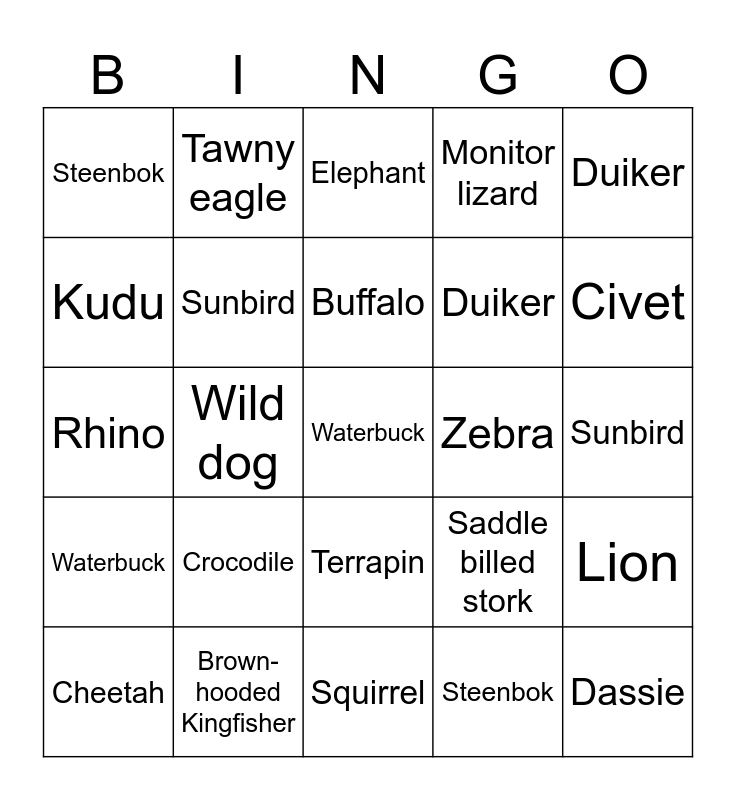⚠ This card has duplicate items: Kudu (2), Fish -eagle (2), Waterbuck (2), Steenbok (2), Babbler (2), Sunbird (2), Impala (2), Duiker (2)