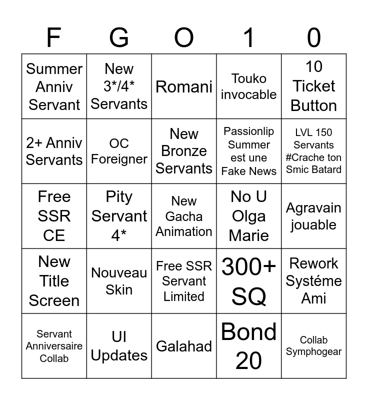 This bingo card has 25 words: Nouveau Skin, Galahad, New Bronze Servants, Servant Anniversaire Collab, 10 Ticket Button, Summer Anniv Servant, 2+ Anniv Servants, New 3*/4* Servants, No U Olga Marie, Free SSR Servant Limited, Passionlip Summer est une Fake News, Free SSR CE, 300+ SQ, Rework Systéme Ami, OC Foreigner, Collab Symphogear, Agravain jouable, Romani, LVL 150 Servants #Crache ton Smic Batard, Pity Servant 4*, New Gacha Animation, UI Updates, New Title Screen, Touko invocable and Bond 20.