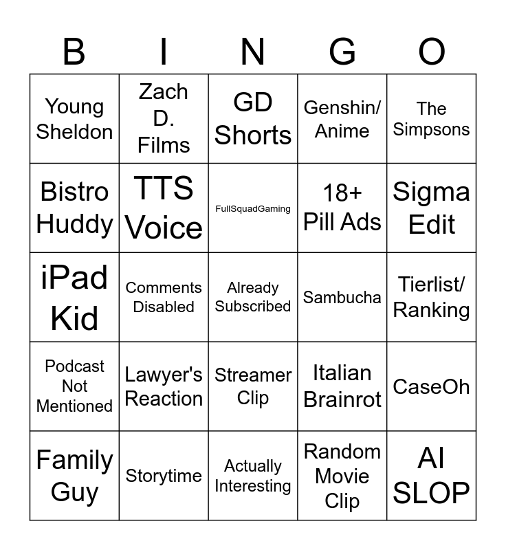 This bingo card has a free space and 24 words: Lawyer's Reaction, Storytime, FullSquadGaming, Family Guy, The Simpsons, Young Sheldon, Bistro Huddy, Zach D. Films, Sambucha, Streamer Clip, 18+ Pill Ads, iPad Kid, Italian Brainrot, CaseOh, TTS Voice, Random Movie Clip, Tierlist/ Ranking, GD Shorts, Sigma Edit, Comments Disabled, AI SLOP, Podcast Not Mentioned, Genshin/ Anime and Actually Interesting.