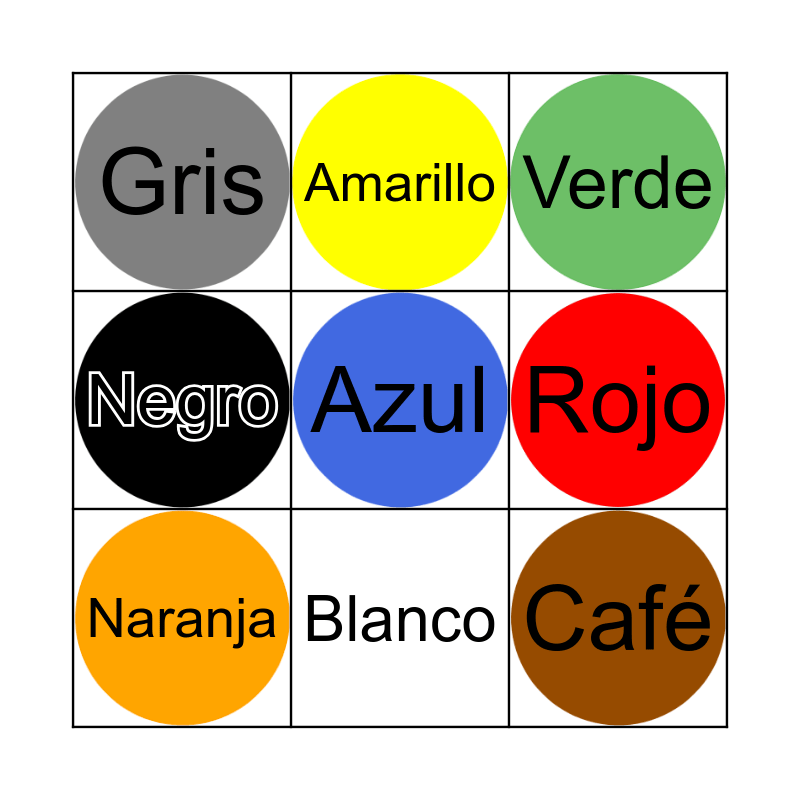 This bingo card has 10 images, a free space and 10 words: Blanco, Verde, Gris, Café, Negro, Naranja, Amarillo, Morado, Rojo and Rosa.