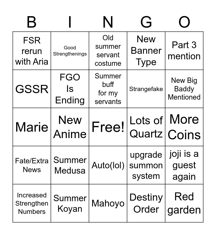 This bingo card has a free space and 24 words: Summer Medusa, Summer Koyan, Summer buff for my servants, Increased Strengthen Numbers, Part 3 mention, FSR rerun with Aria, GSSR, Good Strengthenings, Lots of Quartz, Auto(lol), Strangefake, Marie, upgrade summon system, joji is a guest again, FGO Is Ending, Destiny Order, More Coins, Old summer servant costume, New Big Baddy Mentioned, New Anime, Red garden, Fate/Extra News, New Banner Type and Mahoyo.
