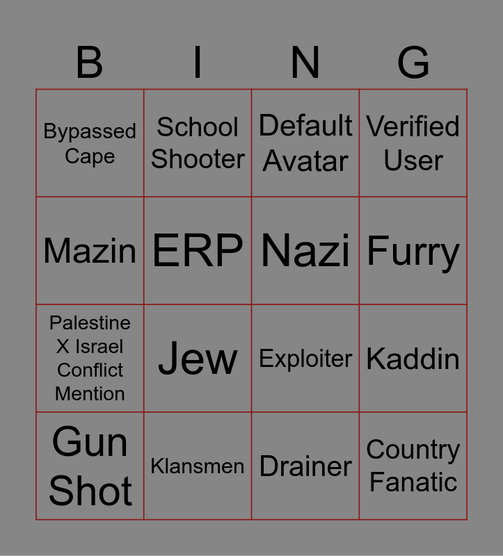 This bingo card has 21 words: Klansmen, Debating, School Shooter, RoMilitary, Drainer, Nazi, Bypassed Cape, Default Avatar, Exploiter, Furry, Palestine X Israel Conflict Mention, Verified User, Country Fanatic, 2x Pride Flags, ERP, Femboy, Gun Shot, Jew, Mazin, Kaddin and scholar.
