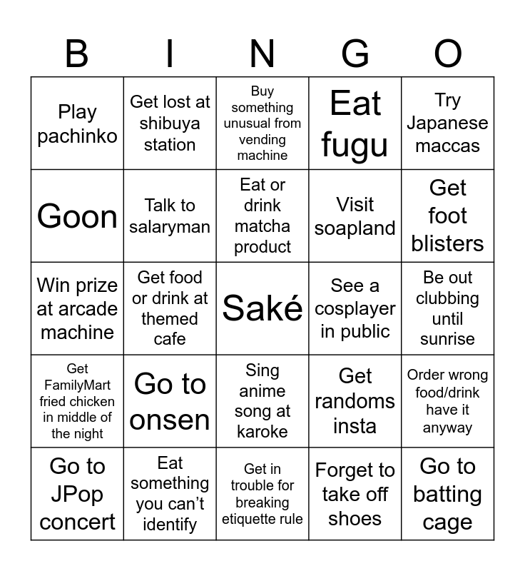 This bingo card has a free space and 24 words: Go to onsen, Eat something you can’t identify, Eat or drink matcha product, Go to JPop concert, Try Japanese maccas, Play pachinko, Goon, Get lost at shibuya station, See a cosplayer in public, Sing anime song at karoke, Visit soapland, Win prize at arcade machine, Get randoms insta, Order wrong food/drink have it anyway, Talk to salaryman, Forget to take off shoes, Be out clubbing until sunrise, Buy something unusual from vending machine, Get foot blisters, Get food or drink at themed cafe, Go to batting cage, Get FamilyMart fried chicken in middle of the night, Eat fugu and Get in trouble for breaking etiquette rule.