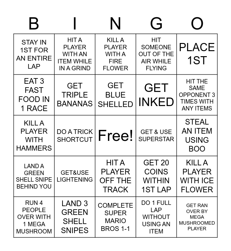 This bingo card has a free space and 24 words: GET&USE LIGHTENING, LAND 3 GREEN SHELL SNIPES, GET BLUE SHELLED, RUN 4 PEOPLE OVER WITH 1 MEGA MUSHROOM, PLACE 1ST, STAY IN 1ST FOR AN ENTIRE LAP, EAT 3 FAST FOOD IN 1 RACE, HIT A PLAYER WITH AN ITEM WHILE IN A GRIND, GET & USE SUPERSTAR, HIT A PLAYER OFF THE TRACK, GET INKED, KILL A PLAYER WITH HAMMERS, GET 20 COINS WITHIN 1ST LAP, KILL A PLAYER WITH ICE FLOWER, GET TRIPLE BANANAS, DO 1 FULL LAP WITHOUT USING AN ITEM, STEAL AN ITEM USING BOO, KILL A PLAYER WITH A FIRE FLOWER, HIT THE SAME OPPONENT 3 TIMES WITH ANY ITEMS, DO A TRICK SHORTCUT, GET RAN OVER BY MEGA MUSHROOMED PLAYER, LAND A GREEN SHELL SNIPE BEHIND YOU, HIT SOMEONE OUT OF THE AIR WHILE FLYING and COMPLETE SUPER MARIO BROS 1-1.