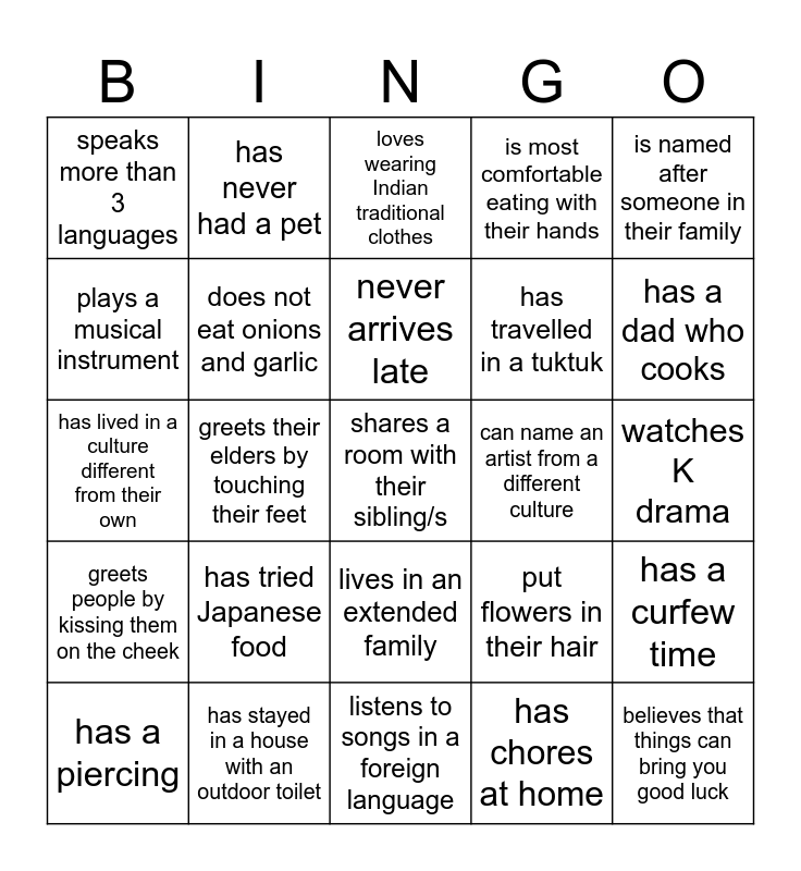 This bingo card has 25 words: has tried Japanese food, listens to songs in a foreign language, never arrives late, has a piercing, is named after someone in their family, speaks more than 3 languages, plays a musical instrument, has never had a pet, can name an artist from a different culture, lives in an extended family, has travelled in a tuktuk, has lived in a culture different from their own, put flowers in their hair, has a curfew time, does not eat onions and garlic, believes that things can bring you good luck, watches K drama, loves wearing Indian traditional clothes, has a dad who cooks, greets their elders by touching their feet, shares a room with their sibling/s, has stayed in a house with an outdoor toilet, greets people by kissing them on the cheek, is most comfortable eating with their hands and has chores at home.