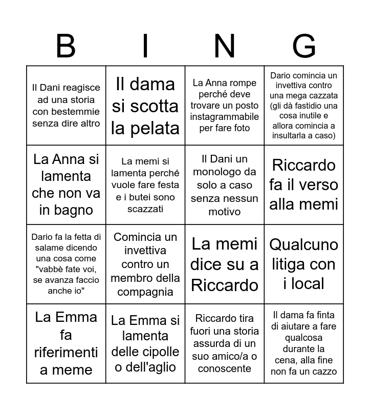 This bingo card has 16 words: La Emma si lamenta delle cipolle o dell'aglio, Qualcuno litiga con i local, La Anna rompe perché deve trovare un posto instagrammabile per fare foto, Il Dani reagisce ad una storia con bestemmie senza dire altro, Dario fa la fetta di salame dicendo una cosa come "vabbè fate voi, se avanza faccio anche io", Il dama si scotta la pelata, La memi dice su a Riccardo, Riccardo tira fuori una storia assurda di un suo amico/a o conoscente, La Anna si lamenta che non va in bagno, La memi si lamenta perché vuole fare festa e i butei sono scazzati, La Emma fa riferimenti a meme, Dario comincia un invettiva contro una mega cazzata (gli dà fastidio una cosa inutile e allora comincia a insultarla a caso), Comincia un invettiva contro un membro della compagnia, Riccardo fa il verso alla memi, Il Dani un monologo da solo a caso senza nessun motivo and Il dama fa finta di aiutare a fare qualcosa durante la cena, alla fine non fa un cazzo.