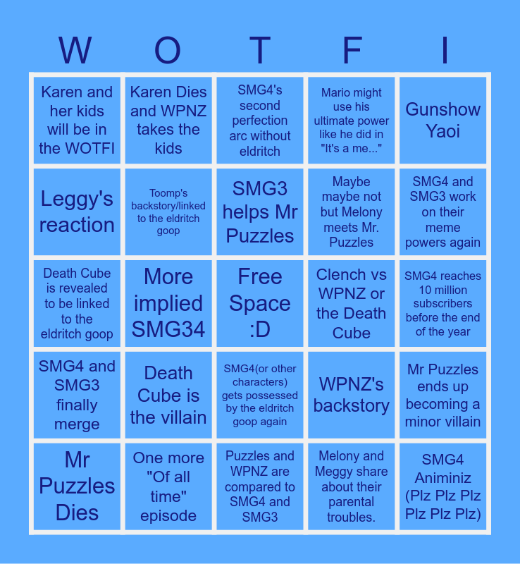 This bingo card has a free space and 24 words: Mr Puzzles Dies, Death Cube is the villain, SMG3 helps Mr Puzzles, Melony and Meggy share about their parental troubles., Gunshow Yaoi, Karen and her kids will be in the WOTFI, Karen Dies and WPNZ takes the kids, SMG4's second perfection arc without eldritch, Clench vs WPNZ or the Death Cube, SMG4 reaches 10 million subscribers before the end of the year, Death Cube is revealed to be linked to the eldritch goop, Toomp's backstory/linked to the eldritch goop, WPNZ's backstory, Mr Puzzles ends up becoming a minor villain, Leggy's reaction, One more "Of all time" episode, Puzzles and WPNZ are compared to SMG4 and SMG3, Mario might use his ultimate power like he did in "It's a me...", SMG4 and SMG3 work on their meme powers again, SMG4 and SMG3 finally merge, More implied SMG34, SMG4(or other characters) gets possessed by the eldritch goop again, Maybe maybe not but Melony meets Mr. Puzzles and SMG4 Animiniz (Plz Plz Plz Plz Plz Plz).