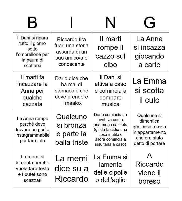 This bingo card has 16 words: La memi dice su a Riccardo, Qualcuno si dimentica qualcosa a casa in appartamento che era stato detto di portare, Il marti rompe il cazzo sul cibo, Il Dani si ripara tutto il giorno sotto l'ombrellone per la paura di scottarsi, La Anna rompe perché deve trovare un posto instagrammabile per fare foto, Riccardo tira fuori una storia assurda di un suo amico/a o conoscente, Dario comincia un invettiva contro una mega cazzata (gli dà fastidio una cosa inutile e allora comincia a insultarla a caso), La Emma si lamenta delle cipolle o dell'aglio, Il marti fa incazzare la Anna per qualche cazzata, Dario dice che ha mal di stomaco e che deve prendere il maalox, La memi si lamenta perché vuole fare festa e i butei sono scazzati, La Anna si incazza giocando a carte, Qualcuno si bronza e parte la balla triste, La Emma si scotta il culo, Il Dani si attiva a caso e comincia a pompare musica and A Riccardo viene il boreso.