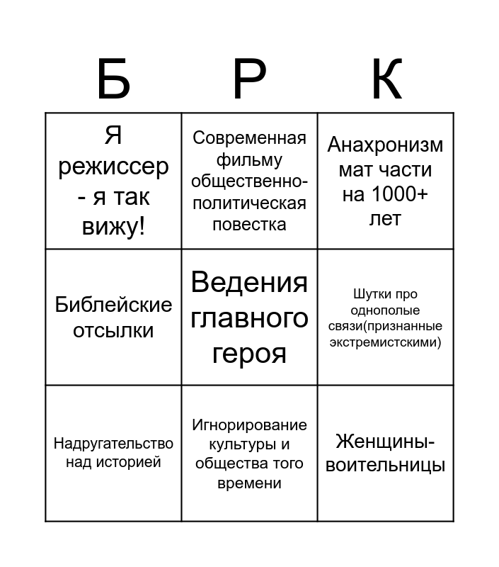 This bingo card has 9 words: Надругательство над историей, Анахронизм мат части на 1000+ лет, Современная фильму общественно-политическая повестка, Библейские отсылки, Я режиссер - я так вижу!, Шутки про однополые связи(признанные экстремистскими), Ведения главного героя, Женщины-воительницы and Игнорирование культуры и общества того времени.