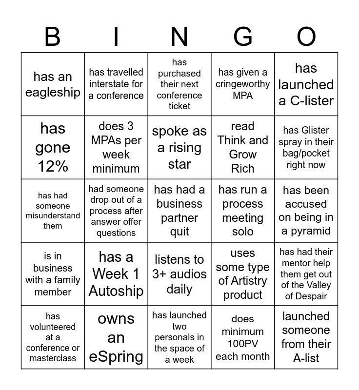 This bingo card has 30 words: owns an eSpring, registered a new customer, had someone drop out of a process after answer offer questions, completed a 90 day core run, has an eagleship, has purchased their next conference ticket, does 3 MPAs per week minimum, listens to 3+ audios daily, has run a process meeting solo, has launched two personals in the space of a week, has been accused on being in a pyramid, has had a business partner quit, does minimum 100PV each month, launched someone from their A-list, has Glister spray in their bag/pocket right now, listens to audios on x2 speed, uses some type of Artistry product, is in business with a family member, has a Week 1 Autoship, has launched a C-lister, has had someone misunderstand them, has attended a Night Owl, has travelled interstate for a conference, read Think and Grow Rich, has gone 12%, has given a cringeworthy MPA, has had their mentor help them get out of the Valley of Despair, has volunteered at a conference or masterclass, spoke as a rising star and took a selfie with a Diamond.