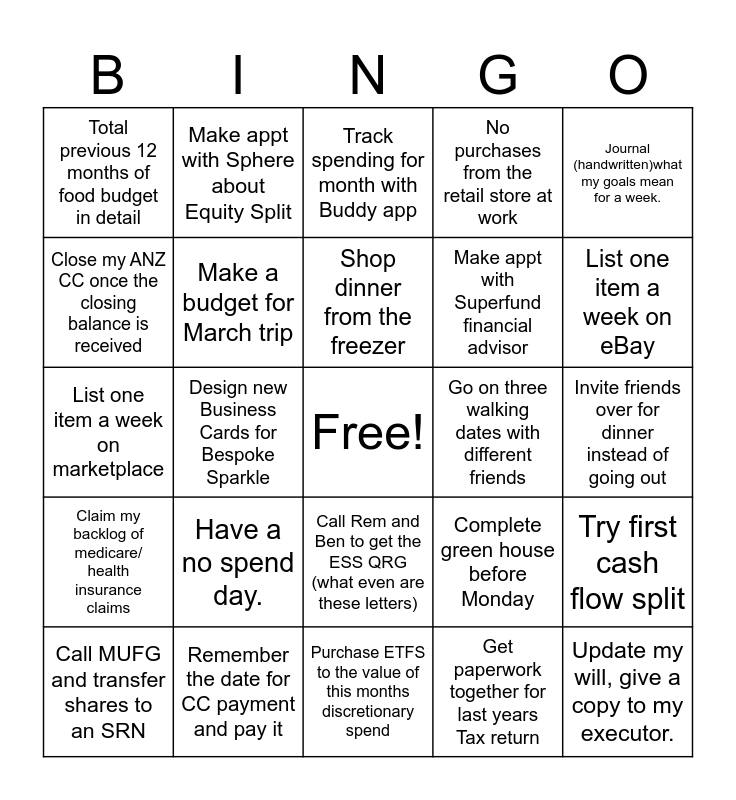 This bingo card has a free space and 24 words: Have a no spend day., Remember the date for CC payment and pay it, Shop dinner from the freezer, Call MUFG and transfer shares to an SRN, Journal (handwritten)what my goals mean for a week., Total previous 12 months of food budget in detail, Close my ANZ CC once the closing balance is received, Make appt with Sphere about Equity Split, Go on three walking dates with different friends, Call Rem and Ben to get the ESS QRG (what even are these letters), Make appt with Superfund financial advisor, List one item a week on marketplace, Complete green house before Monday, Try first cash flow split, Make a budget for March trip, Get paperwork together for last years Tax return, Invite friends over for dinner instead of going out, Track spending for month with Buddy app, List one item a week on eBay, Design new Business Cards for Bespoke Sparkle, Update my will, give a copy to my executor., Claim my backlog of medicare/ health insurance claims, No purchases from the retail store at work and Purchase ETFS to the value of this months discretionary spend.