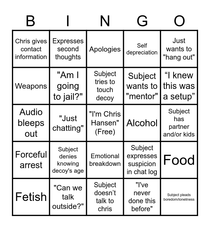 This bingo card has a free space and 32 words: "I've never done this before", Condoms, "Just chatting", "My life is over", Forceful arrest, "Am I going to jail?", Just wants to "hang out", Food, Expresses second thoughts, "I'll never do this again", Subject tries to touch decoy, Apologies, Chris gets aggressive, Subject needs water, Alcohol, Decoy under 14, Fetish, Audio bleeps out, Emotional breakdown, Subject denies knowing decoy's age, Subject expresses suspicion in chat log, Subject wants to turn off camera, Subject has partner and/or kids, "Can we talk outside?", Subject pleads boredom/loneliness, Self depreciation, Subject wants to "mentor", Weapons, Chris gives contact information, Subject doesn’t talk to chris, Subject asks to leave and “I knew this was a setup”.