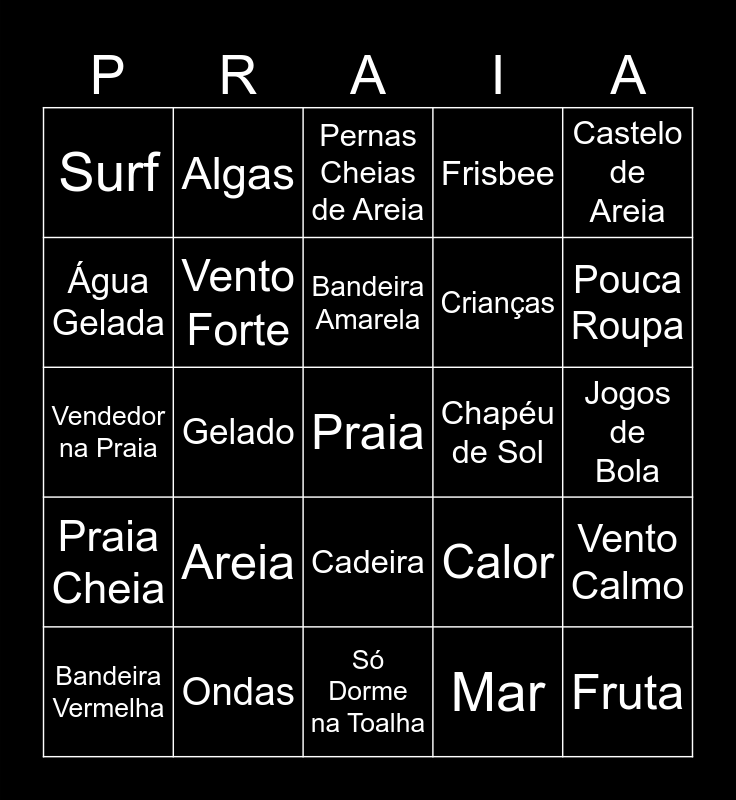 This bingo card has a free space and 24 words: Areia, Ondas, Bandeira Amarela, Bandeira Vermelha, Castelo de Areia, Surf, Água Gelada, Algas, Chapéu de Sol, Cadeira, Crianças, Vendedor na Praia, Calor, Vento Calmo, Vento Forte, Mar, Jogos de Bola, Pernas Cheias de Areia, Pouca Roupa, Gelado, Fruta, Praia Cheia, Frisbee and Só Dorme na Toalha.