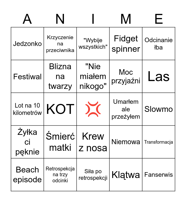This bingo card has a free space and 24 words: Śmierć matki, Retrospekcja na trzy odcinki, "Nie miałem nikogo", Beach episode, Odcinanie łba, Jedzonko, Festiwal, Krzyczenie na przeciwnika, Umarłem ale przeżyłem, Krew z nosa, Moc przyjaźni, Lot na 10 kilometrów, Niemowa, Transformacja, Blizna na twarzy, Klątwa, Slowmo, "Wybije wszystkich", Las, KOT, Fanserwis, Żyłka ci pęknie, Fidget spinner and Siła po retrospekcji.