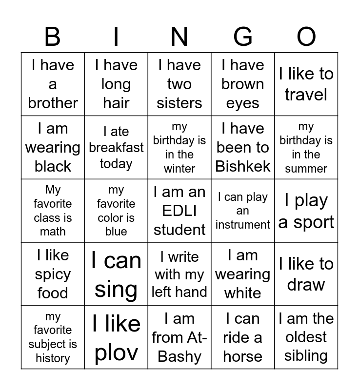 This bingo card has a free space and 24 words: I can sing, I like plov, my birthday is in the winter, my favorite subject is history, I like to travel, I have a brother, I am wearing black, I have long hair, I can play an instrument, I write with my left hand, I have been to Bishkek, My favorite class is math, I am wearing white, I like to draw, I ate breakfast today, I can ride a horse, I play a sport, I have two sisters, my birthday is in the summer, my favorite color is blue, I am the oldest sibling, I like spicy food, I have brown eyes and I am from At-Bashy.
