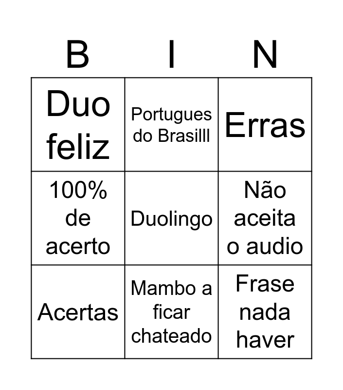 This bingo card has a free space and 11 words: Palavra obiva, Mambo a ficar chateado, Frase nada haver, Acertas, Portugues do Brasilll, Erras, Não aceita o audio, Gaja da voz fumante, 100% de acerto, Duo feliz and Chinês???.