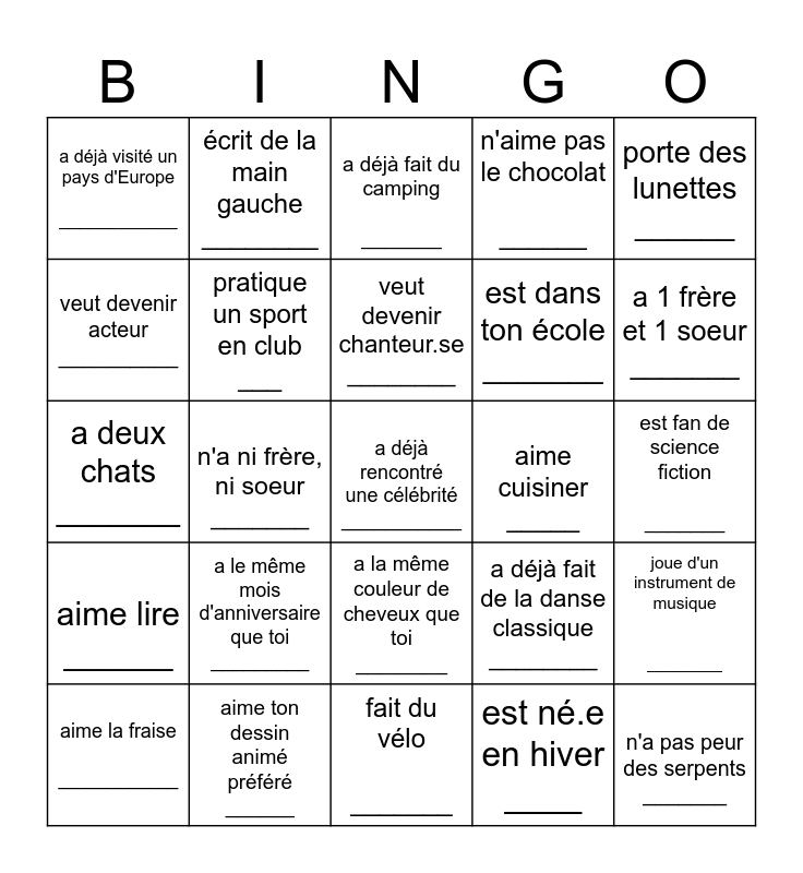 This bingo card has a free space and 24 words: a le même mois d'anniversaire que toi _________, aime ton dessin animé préféré ______, veut devenir chanteur.se ________, aime la fraise ___________, porte des lunettes ______, a déjà visité un pays d'Europe ____________, veut devenir acteur __________, écrit de la main gauche ________, aime cuisiner _____, a la même couleur de cheveux que toi ________, est dans ton école _______, a deux chats _______, a déjà fait de la danse classique ________, joue d'un instrument de musique ________, pratique un sport en club ___, est né.e en hiver ____, est fan de science fiction _______, a déjà fait du camping _______, a 1 frère et 1 soeur _______, n'a ni frère, ni soeur _______, n'a pas peur des serpents _______, aime lire ______, n'aime pas le chocolat ______ and fait du vélo _______.