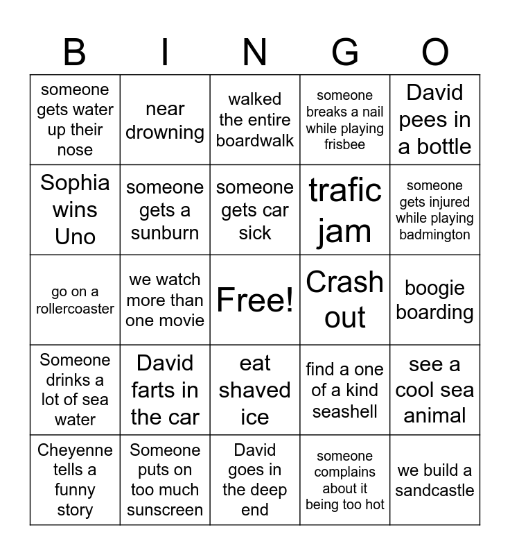 This bingo card has a free space and 24 words: David farts in the car, Someone puts on too much sunscreen, someone gets car sick, Cheyenne tells a funny story, David pees in a bottle, someone gets water up their nose, Sophia wins Uno, near drowning, Crash out, eat shaved ice, trafic jam, go on a rollercoaster, find a one of a kind seashell, see a cool sea animal, someone gets a sunburn, someone complains about it being too hot, boogie boarding, walked the entire boardwalk, someone gets injured while playing badmington, we watch more than one movie, we build a sandcastle, Someone drinks a lot of sea water, someone breaks a nail while playing frisbee and David goes in the deep end.