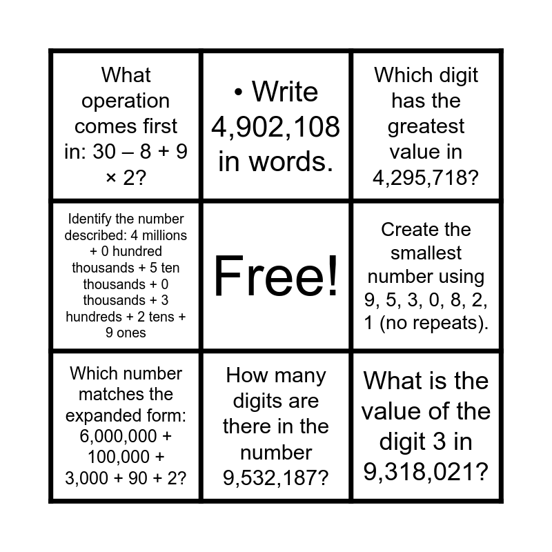 This bingo card has a free space and 21 words: What is the place value of 7 in 7,452,398?, Solve: 4 + 6 × (8 – 3), Which digit has the greatest value in 4,295,718?, Write 6,807,042 in expanded form., What is the answer to (20 – 5) × 3 + 6?, • What is the standard form of “Nine million, two hundred ten thousand, five”?, What operation comes first in: 30 – 8 + 9 × 2?, • Write 4,902,108 in words., If both lines meet at one point, what does it show?, Which number matches the expanded form: 6,000,000 + 100,000 + 3,000 + 90 + 2?, How many digits are there in the number 9,532,187?, Create the smallest number using 9, 5, 3, 0, 8, 2, 1 (no repeats)., What is the smallest number you can make using the digits 2, 5, 9, 1, 3, 6, and 0 without repeating any digit?, What graph would best show the daily temperature in a week?, What is the value of the digit 3 in 9,318,021?, What is the value of 8 + (12 ÷ 4) × 3?, Which digit in 5,239,671 has the least value?, Solve: (16 + 4) ÷ 2 + 12, Identify the number described: 4 millions + 0 hundred thousands + 5 ten thousands + 0 thousands + 3 hundreds + 2 tens + 9 ones, Arrange from greatest to least: 6,104,200; 6,140,020; 6,014,200 and Which graph is ideal to compare votes from five candidates?.