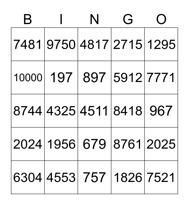 This bingo card has a free space and 24 words: 6304, 1956, 897, 1826, 1295, 7481, 9750, 4817, 8418, 967, 8744, 197, 8761, 2025, 10000, 4553, 757, 2715, 7771, 2024, 4325, 679, 5912 and 7521.