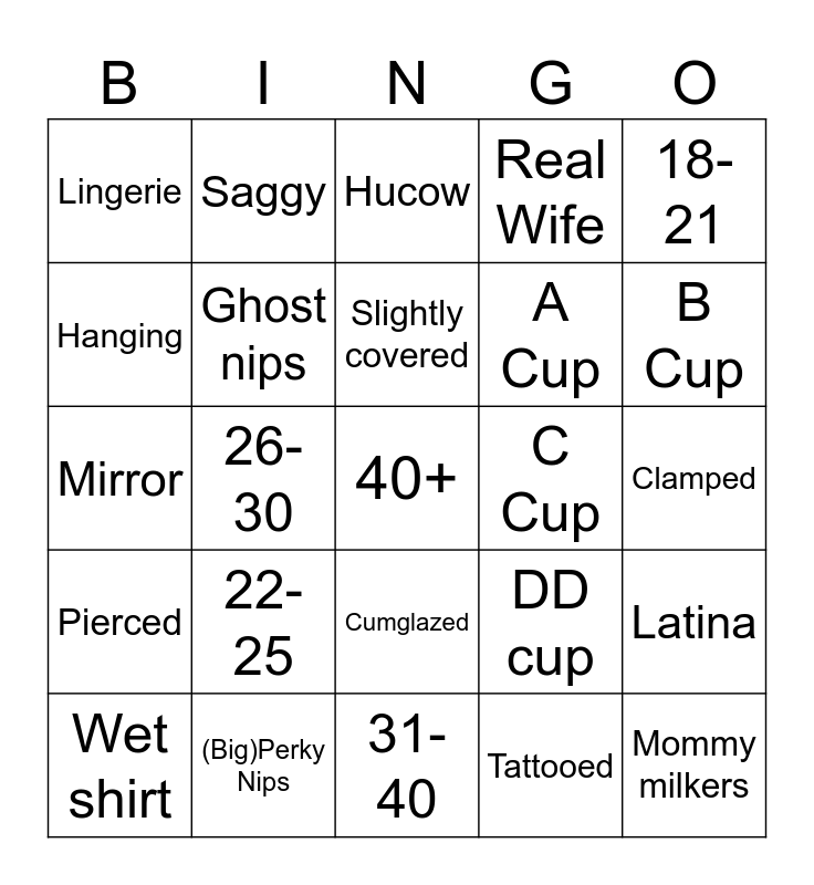This bingo card has a free space and 24 words: 22-25, (Big)Perky Nips, Slightly covered, Wet shirt, 18-21, Lingerie, Hanging, Saggy, C Cup, Cumglazed, A Cup, Mirror, DD cup, Latina, Ghost nips, Tattooed, Clamped, Hucow, B Cup, 26-30, Mommy milkers, Pierced, Real Wife and 31-40.