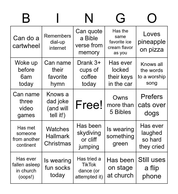 This bingo card has a free space and 24 words: Watches Hallmark Christmas, Is wearing fun socks today, Drank 3+ cups of coffee today, Has ever fallen asleep in church (oops!), Loves pineapple on pizza, Can do a cartwheel, Woke up before 6am today, Remembers dial-up internet, Owns more than 5 Bibles, Has been skydiving or cliff jumping, Has ever locked their keys in the car, Can name three video games, Is wearing something green, Has ever laughed so hard they cried, Can name their favorite hymn, Has been on stage at church, Prefers cats over dogs, Can quote a Bible verse from memory, Knows all the words to a worship song, Knows a dad joke (and will tell it!), Still uses a flip phone, Has met someone from another continent, Has the same favorite ice cream flavor as you and Has tried a TikTok dance (or attempted it).