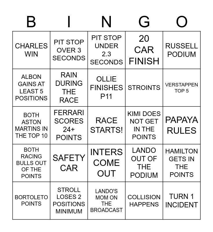 This bingo card has a free space and 24 words: SAFETY CAR, STROLL LOSES 2 POSITIONS MINIMUM, OLLIE FINISHES P11, BORTOLETO POINTS, RUSSELL PODIUM, CHARLES WIN, ALBON GAINS AT LEAST 5 POSITIONS, PIT STOP OVER 3 SECONDS, KIMI DOES NOT GET IN THE POINTS, INTERS COME OUT, STROINTS, BOTH ASTON MARTINS IN THE TOP 10, LANDO OUT OF THE PODIUM, HAMILTON GETS IN THE POINTS, RAIN DURING THE RACE, COLLISION HAPPENS, PAPAYA RULES, PIT STOP UNDER 2.3 SECONDS, VERSTAPPEN TOP 5, FERRARI SCORES 24+ POINTS, TURN 1 INCIDENT, BOTH RACING BULLS OUT OF THE POINTS, 20 CAR FINISH and LANDO'S MOM ON THE BROADCAST.