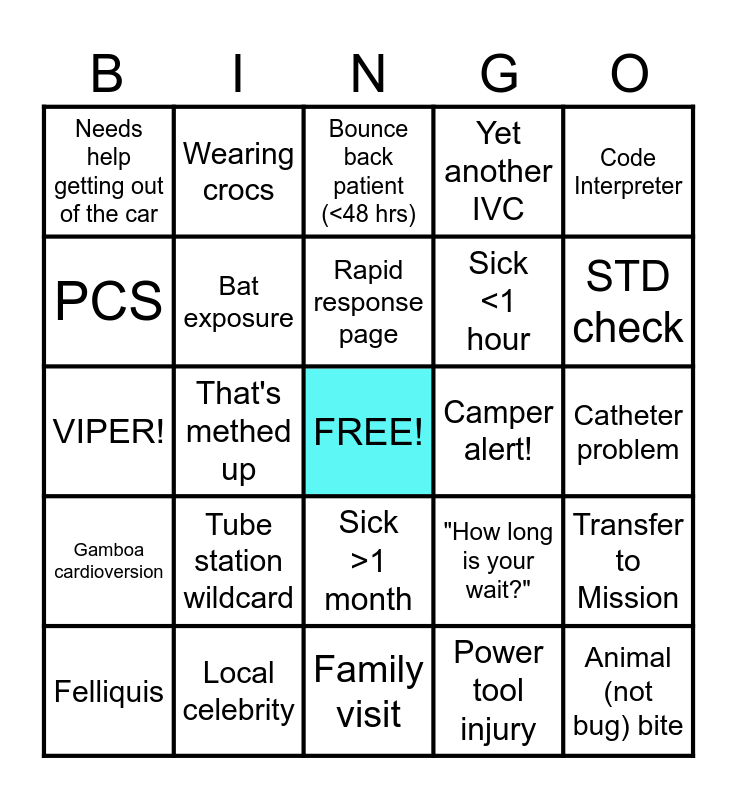 This bingo card has a free space and 24 words: Tube station wildcard, Local celebrity, Rapid response page, Felliquis, Code Interpreter, Needs help getting out of the car, PCS, Wearing crocs, Camper alert!, Sick >1 month, Sick <1 hour, VIPER!, "How long is your wait?", Transfer to Mission, Bat exposure, Power tool injury, Catheter problem, Bounce back patient (<48 hrs), STD check, That's methed up, Animal (not bug) bite, Gamboa cardioversion, Yet another IVC and Family visit.