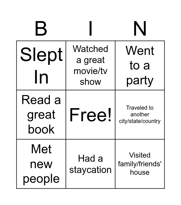 This bingo card has a free space and 8 words: Traveled to another city/state/country, Went to a party, Watched a great movie/tv show, Met new people, Slept In, Visited family/friends' house, Read a great book and Had a staycation.