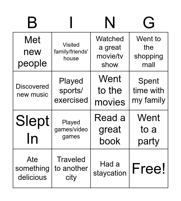 This bingo card has 16 words: Traveled to another city, Went to a party, Watched a great movie/tv show, Met new people, Slept In, Visited family/friends' house, Read a great book, Had a staycation, Discovered new music, Played sports/ exercised, Ate something delicious, Went to the shopping mall, Played games/video games, Spent time with my family, Went to the movies and Free!.
