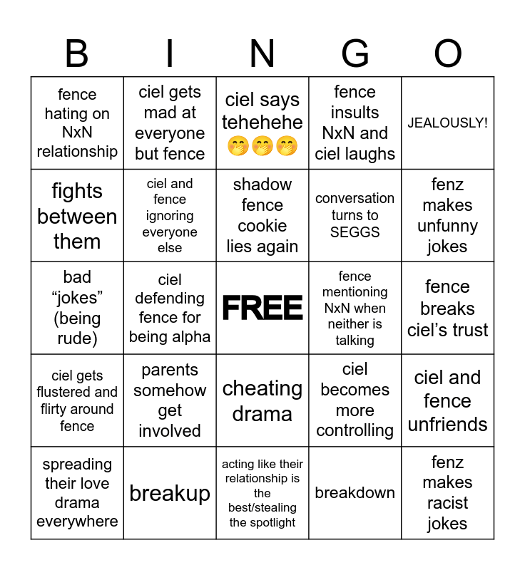 This bingo card has a free space and 26 words: cheating drama, breakdown, shadow fence cookie lies again, breakup, JEALOUSLY!, fence hating on NxN relationship, fights between them, ciel gets mad at everyone but fence, fence breaks ciel’s trust, ciel becomes more controlling, conversation turns to SEGGS, bad “jokes” (being rude), ciel and fence unfriends, spreading their love drama everywhere, ciel defending fence for being alpha, fence kicked from gc, fence insults NxN and ciel laughs, ciel gets flustered and flirty around fence, ciel says tehehehe 🤭🤭🤭, fenz makes racist jokes, fenz makes unfunny jokes, acting like their relationship is the best/stealing the spotlight, fence mentioning NxN when neither is talking, parents somehow get involved, ciel and fence ignoring everyone else and they become healthy!!!!! 😇😇😇.