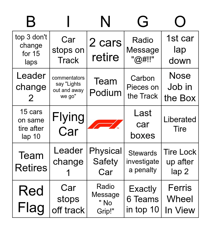 This bingo card has a free space and 34 words: 1st car retires, Exactly 6 Teams in top 10, Virtual Safety Car, Bad pit over 4 sec., Team Retires, commentators say "Lights out and away we go", 1st car lap down, Red Flag, Car stops on Track, 1st Car in the Box, Team Podium, 2 cars retire, Rookie Passes Rookie on Track, Cheating Confirmed, Last car boxes, Nose Job in the Box, Car stops off track, 15 cars on same tire after lap 10, Leader change 1, Stewards investigate a penalty, Physical Safety Car, Yellow Flag, top 3 don't change for 15 laps, Liberated Tire, Radio Message " No Grip!", Ferris Wheel In View, Radio Message "@#!!", Box Under 2.8s, Carbon Pieces on the Track, Leader change 2, Gratuitous Celebrity sighting, Flying Car, Tire Lock up after lap 2 and Youngest leads oldest.