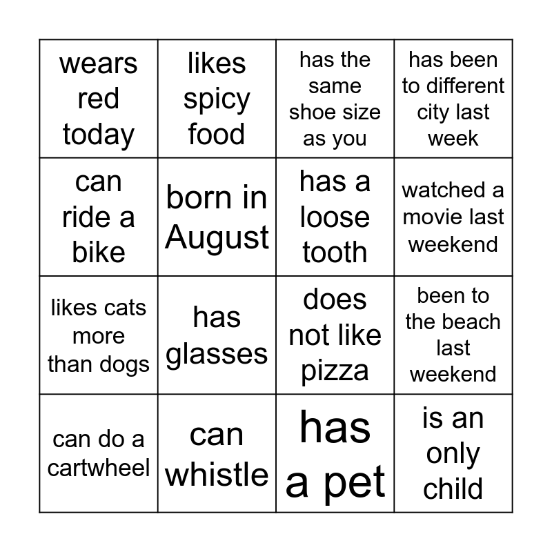 This bingo card has 16 words: can whistle, been to the beach last weekend, has the same shoe size as you, wears red today, likes cats more than dogs, likes spicy food, does not like pizza, has a pet, can ride a bike, born in August, can do a cartwheel, has been to different city last week, has glasses, watched a movie last weekend, has a loose tooth and is an only child.