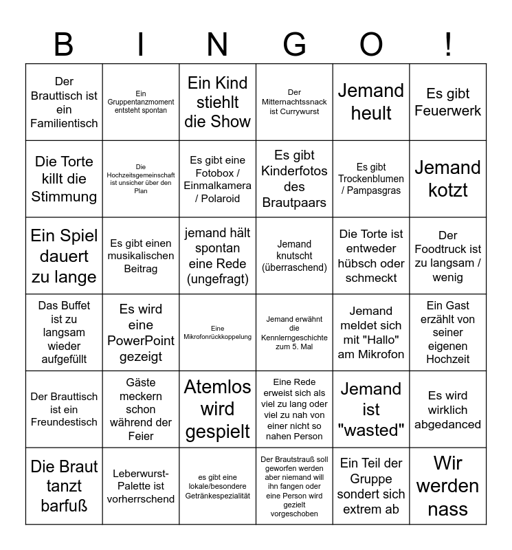 This bingo card has 36 words: Eine Rede erweist sich als viel zu lang oder viel zu nah von einer nicht so nahen Person, Atemlos wird gespielt, Der Brautstrauß soll geworfen werden aber niemand will ihn fangen oder eine Person wird gezielt vorgeschoben, Die Torte killt die Stimmung, Das Buffet ist zu langsam wieder aufgefüllt, Jemand knutscht (überraschend), Die Hochzeitsgemeinschaft ist unsicher über den Plan, es gibt eine lokale/besondere Getränkespezialität, Jemand heult, Jemand ist "wasted", Jemand kotzt, Der Mitternachtssnack ist Currywurst, Es wird wirklich abgedanced, Es gibt einen musikalischen Beitrag, Es gibt Kinderfotos des Brautpaars, Der Brauttisch ist ein Familientisch, Der Brauttisch ist ein Freundestisch, Die Torte ist entweder hübsch oder schmeckt, Ein Spiel dauert zu lange, Ein Kind stiehlt die Show, jemand hält spontan eine Rede (ungefragt), Es wird eine PowerPoint gezeigt, Jemand erwähnt die Kennlerngeschichte zum 5. Mal, Eine Mikrofonrückkoppelung, Jemand meldet sich mit "Hallo" am Mikrofon, Ein Gruppentanzmoment entsteht spontan, Es gibt Trockenblumen / Pampasgras, Leberwurst-Palette ist vorherrschend, Es gibt eine Fotobox / Einmalkamera / Polaroid, Es gibt Feuerwerk, Wir werden nass, Die Braut tanzt barfuß, Ein Gast erzählt von seiner eigenen Hochzeit, Der Foodtruck ist zu langsam / wenig, Gäste meckern schon während der Feier and Ein Teil der Gruppe sondert sich extrem ab.