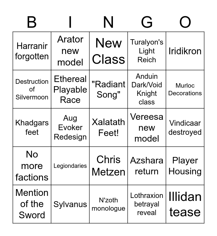 This bingo card has a free space and 24 words: Legiondaries, Sylvanus, "Radiant Song", Mention of the Sword, Iridikron, Harranir forgotten, Destruction of Silvermoon, Arator new model, Vereesa new model, Chris Metzen, Anduin Dark/Void Knight class, Khadgars feet, Azshara return, Player Housing, Ethereal Playable Race, Lothraxion betrayal reveal, Vindicaar destroyed, New Class, Murloc Decorations, Aug Evoker Redesign, Illidan tease, No more factions, Turalyon's Light Reich and N'zoth monologue.