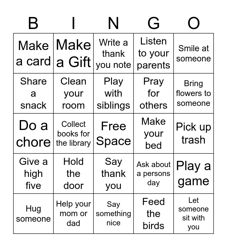 This bingo card has a free space and 25 words: Hold the door, Say something nice, Play with siblings, Hug someone, Smile at someone, Make a card, Share a snack, Make a Gift, Make your bed, Say thank you, Pray for others, Do a chore, Ask about a persons day, Play a game, Clean your room, Donate clothes or toys, Pick up trash, Write a thank you note, Bring flowers to someone, Collect books for the library, Let someone sit with you, Help your mom or dad, Give a high five, Listen to your parents and Feed the birds.