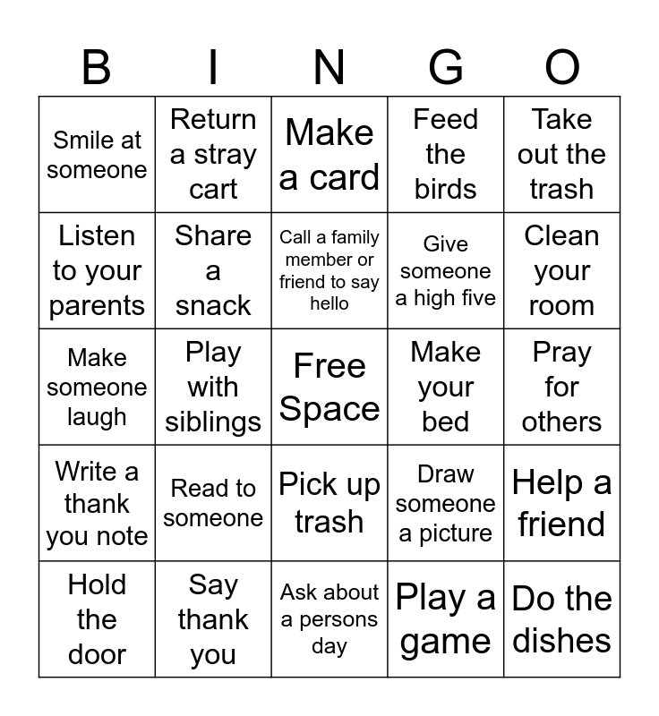 This bingo card has a free space and 29 words: Hold the door, Give someone a compliment, Play with siblings, Hug someone, Smile at someone, Make a card, Share a snack, Read to someone, Make your bed, Say thank you, Pray for others, Do the dishes, Ask about a persons day, Play a game, Clean your room, Donate clothes or toys, Pick up trash, Write a thank you note, Take out the trash, Make someone laugh, Draw someone a picture, Help your mom or dad, Give someone a high five, Listen to your parents, Feed the birds, Return a stray cart, Help a friend, Call a family member or friend to say hello and Bake cookies for a neighbor.
