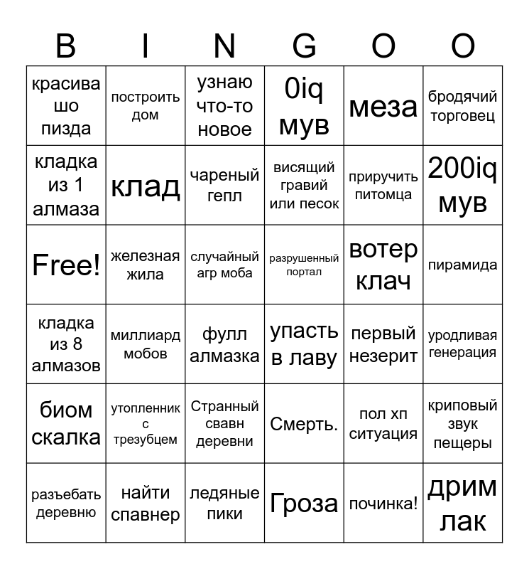 This bingo card has 36 words: Смерть., Странный свавн деревни, Гроза, кладка из 1 алмаза, кладка из 8 алмазов, разрушенный портал, клад, ледяные пики, меза, пол хп ситуация, 200iq мув, 0iq мув, криповый звук пещеры, железная жила, висящий гравий или песок, красива шо пизда, биом скалка, вотер клач, Free!, узнаю что-то новое, случайный агр моба, миллиард мобов, упасть в лаву, фулл алмазка, первый незерит, построить дом, приручить питомца, найти спавнер, чареный гепл, бродячий торговец, дрим лак, разъебать деревню, уродливая генерация, пирамида, утопленник с трезубцем and починка!.