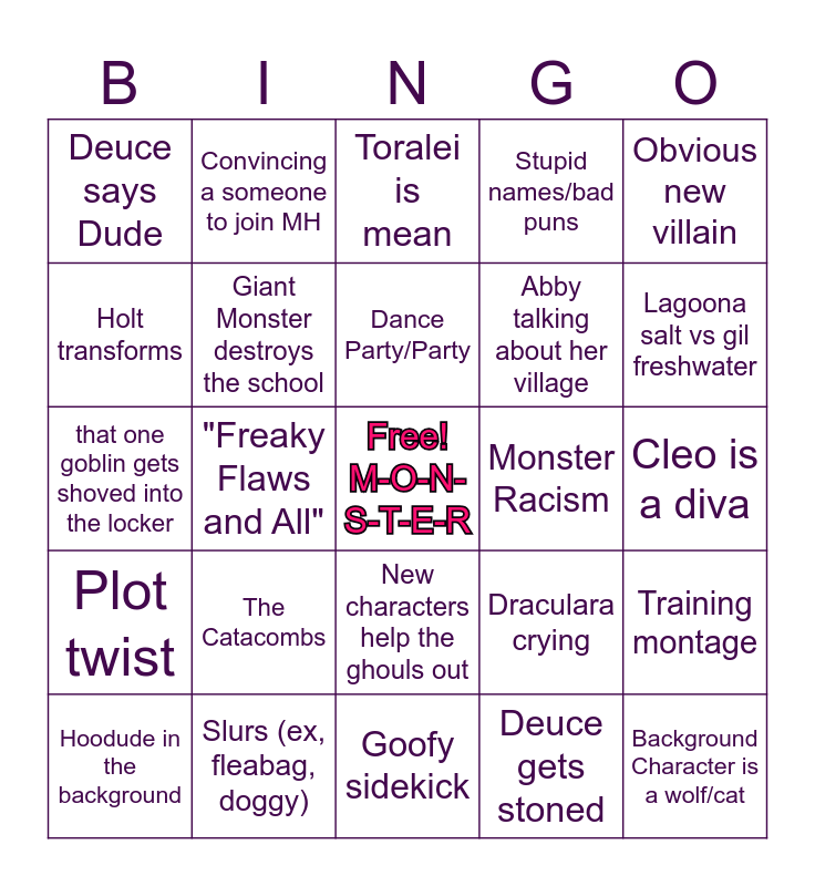 This bingo card has a free space and 32 words: Deuce gets stoned, Frankie saves the day, "Freaky Flaws and All", Ghoulia uses her computer, Plot twist, Giant Monster destroys the school, Obvious new villain, Training montage, Convincing a someone to join MH, New Outfits, Dance Party/Party, Toralei is mean, Frankie electrocutes someone, Monster spreading gossip, Monster Racism, Heath or abby burn/ice, Hoodude in the background, that one goblin gets shoved into the locker, New characters help the ghouls out, The Catacombs, Draculara crying, Sale/shopping, Cleo is a diva, Slurs (ex, fleabag, doggy), Background Character is a wolf/cat, Stupid names/bad puns, Abby talking about her village, Holt transforms, Deuce says Dude, Goofy sidekick, Frankie narrates and Lagoona salt vs gil freshwater.